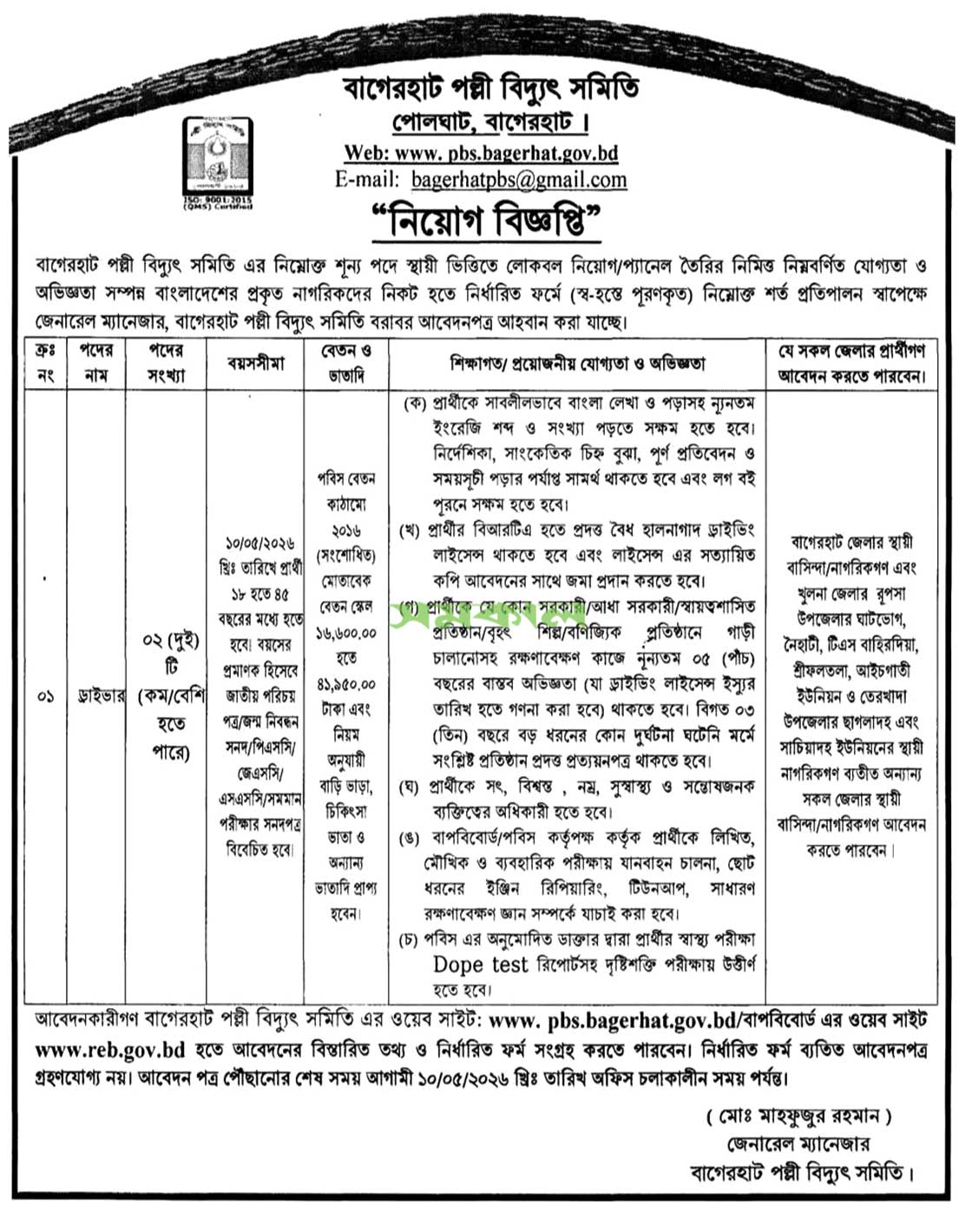 বাগেরহাট পল্লী বিদ্যুৎ সমিতি নিয়োগ বিজ্ঞপ্তি ২০২৬: ড্রাইভার পদে স্থায়ী চাকরির সুযোগ